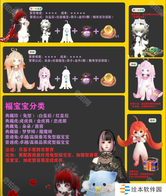 尽量不要跨品种繁育,例如需要【朵朵】或者【茜茜】就用典藏兔福宝宝去繁育(红/白皇后,朵朵/茜茜都是兔形),梦梦绮/魔魔绮是猫形,如果加这两个繁育是可能歪猫形福宝宝的,以下是福宝宝的类型分类。