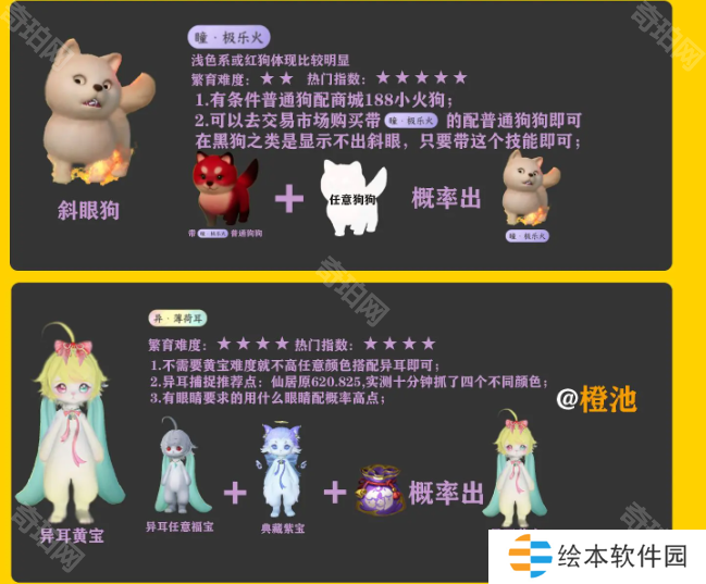 ①斜眼小狗:用带有【瞳·极乐火】的狗狗+任意狗狗,就概率出斜眼小狗,白色/红色小狗更加明显,另外如果和小天狗配,概率出血河专属拉风狗。