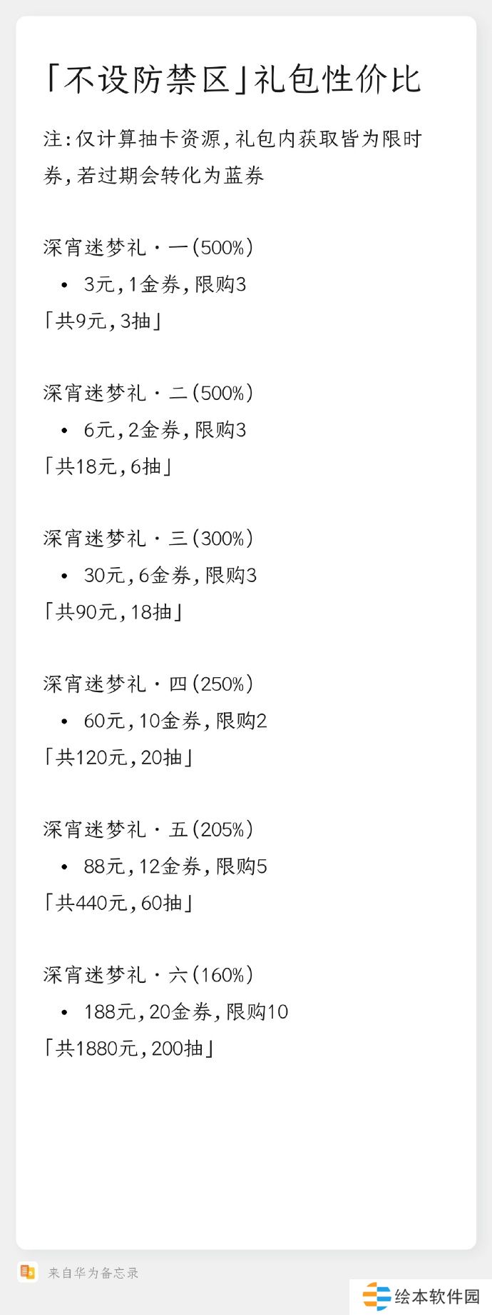 ps:仅计算抽卡资源,礼包内获取皆为限时券,若过期会转化为蓝券