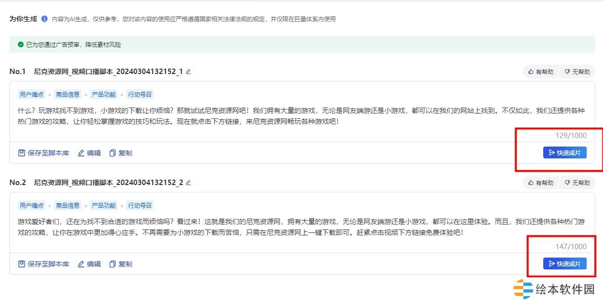 5、这样就可以生成一段视频的脚本了,然后点击自己喜欢的一段口播脚本,点击【快速成片】。