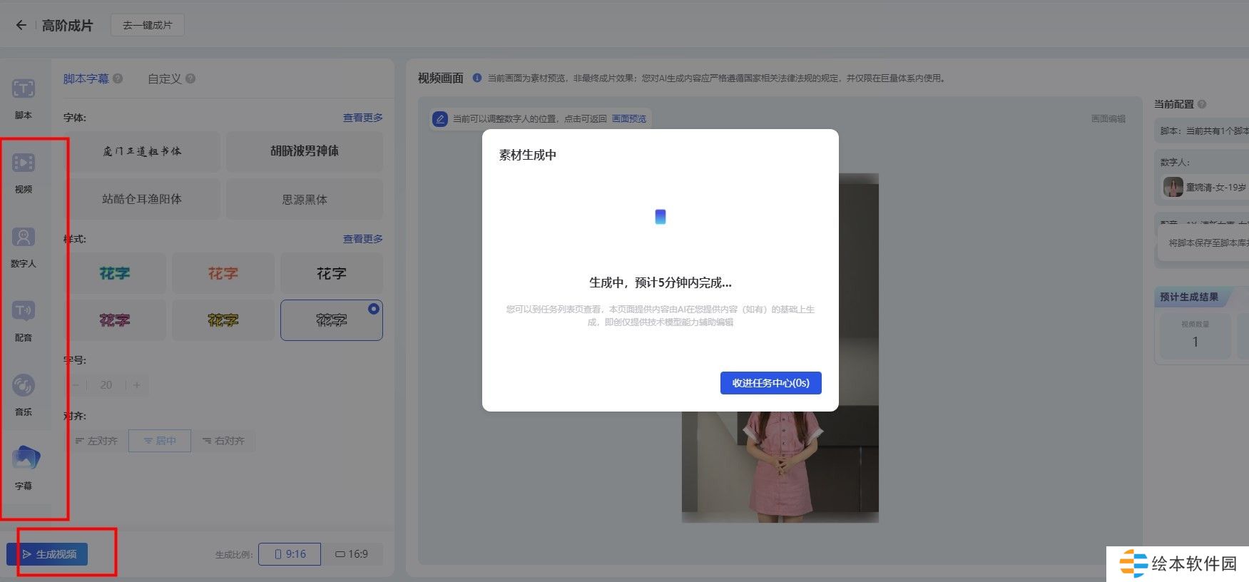 6、然后选择视频、数字人、配音、音乐、字幕即可,还可以上传自己的视频加入哦,全部填写完成后点击【生成视频】即可。