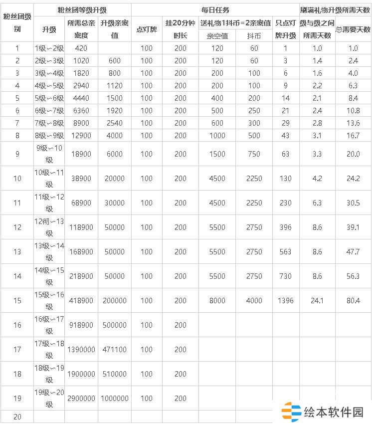 4、抖音粉丝团等级1-20级经验对应表。回复如下:一级:0-1500需+1500。二级:1500-3000需+1500。***:3000-8500需+5500。四级:8500-12350需+3850。每日亲密度没有上限。