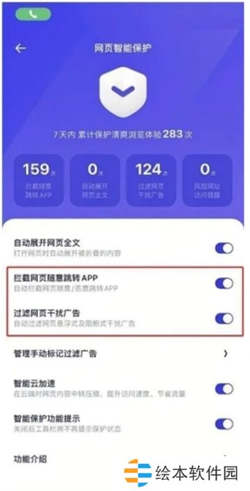 3、最后关闭“拦截网页随意跳转app”和“过滤网页干扰广告”即可。
