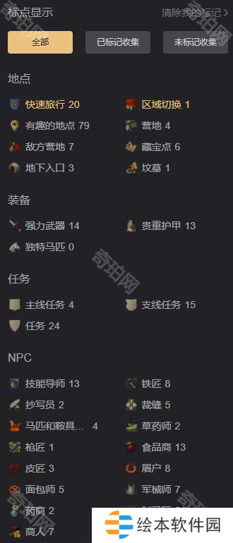 地图中可以显示地点、装备、任务、NPC、设施和其他位置