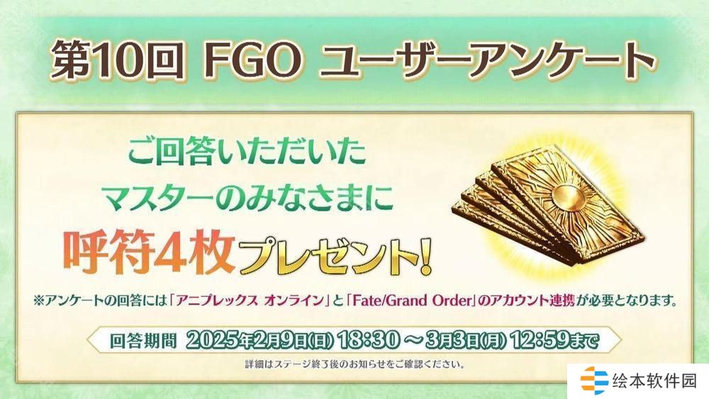 期间内 2 月 9 日~3 月 3 日实施第 10 次《Fate/Grand Order》用户问券调查,完成问券即可获得唿符 4 张。