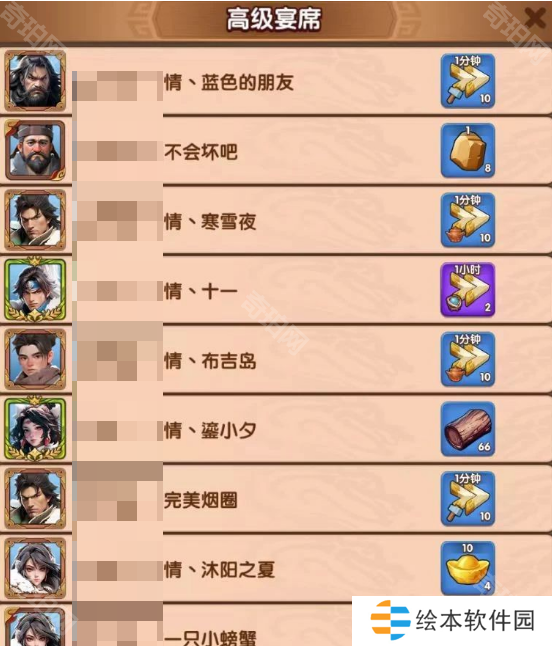 高级:1小时加速,马粮,马革,玄铁,精金,紫檀木,元宝,黄铜,1分钟加速