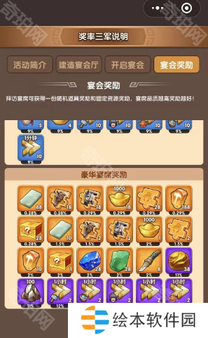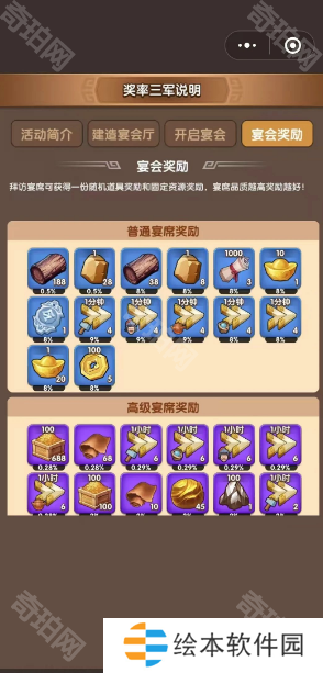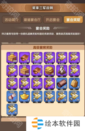宴会活动和烽火台任务相似,宴席一共持续15分钟,每3分钟开一次,每一波刷新4个宴席,总共5波,随机普通和高级宴席,比如2个普通宴席,2个高级宴席,亦或者是4个普通宴席,有玩家购买了商城的宴席礼包的话,可以加码领取礼包奖励,开启宴会活动后,领取奖励结束时间为十个小时,在这段时间内,宴会厅附近都会刷新宴会席位,需要玩家自行点击,所有赴宴都会获得一个随机奖励,宴席品质越好,奖励越好,十五分钟结束刷新后,席位依旧可以保留十个小时,如果宴会厅附近没有了,需要在领地内自行寻找,奖励只看运气,和盟里阶级无关,目前不清楚刷新更好宴席概率是不是和同盟每周获得的总功勋有关,同盟功勋越高,奖励越好。