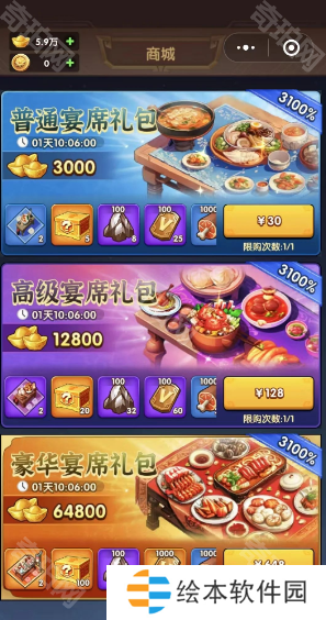 ①争夺州府期间,获得功勋,每周可以使用功勋免费举办一次,重置时间为周一,宴会开启后,宴会厅四周刷新出宴会席,主界面左下角出现图标,点击前往获得随机奖励,宴会期间可以选择加码礼包,在商城里面购买。