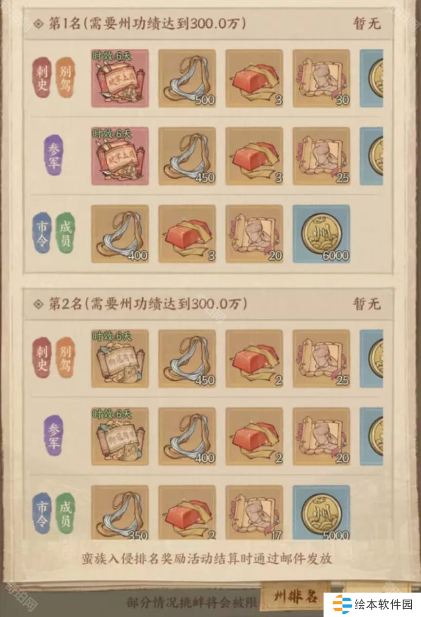 ③州层面的奖励算是很香了,除了普遍的高级强化石及鎏金银丝等奖励,排名前3的州,参军以上的玩家还可以获取一个限时称号,挺好看的。
