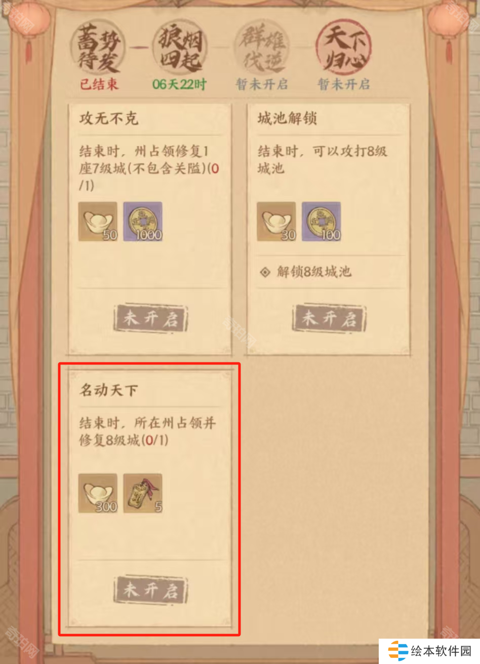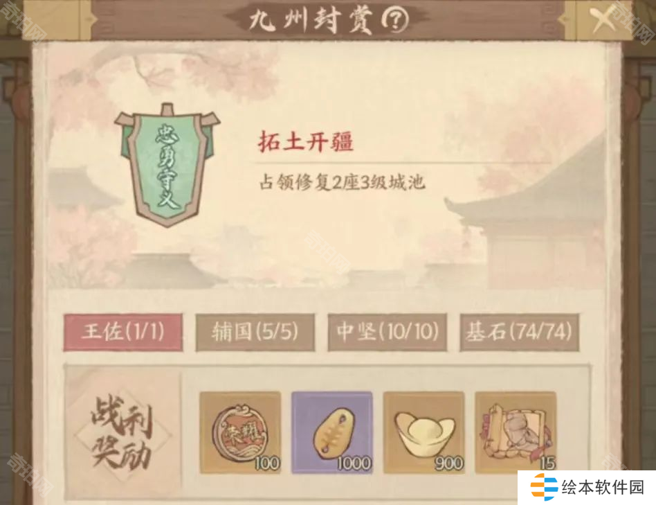 2、九州重任的阶段变成四个,并且很多奖励都进行了变动,如名动天下的奖励由20个招贤令→5个招贤令。