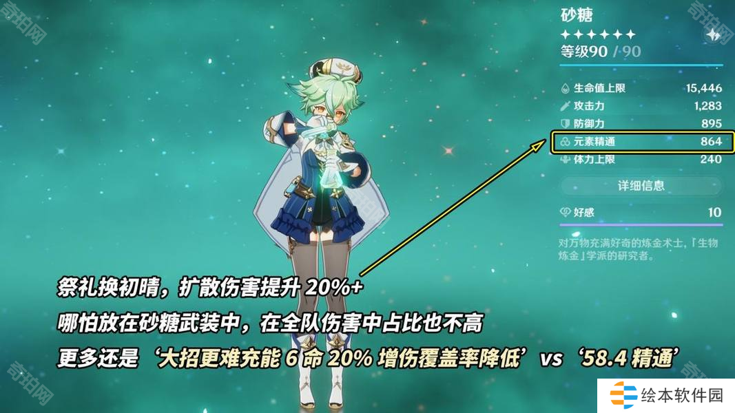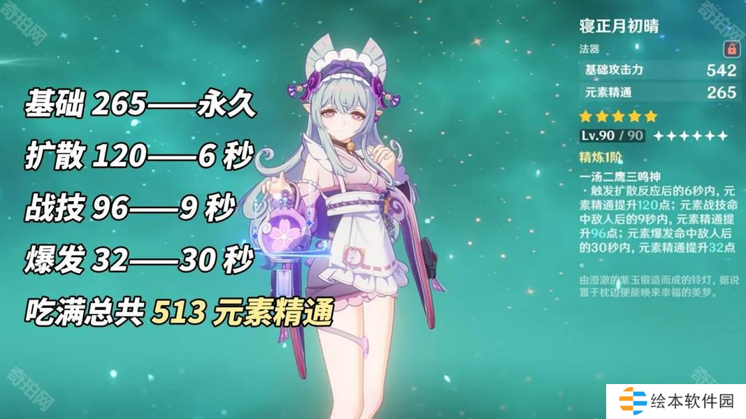 属性方面可用一句话形容‘提供大量元素精通”:542基础攻击力,265元素精通,触发扩散120精通(6秒),战技命中敌人96精通(9秒),元素爆发命中敌人32精通(30秒)。