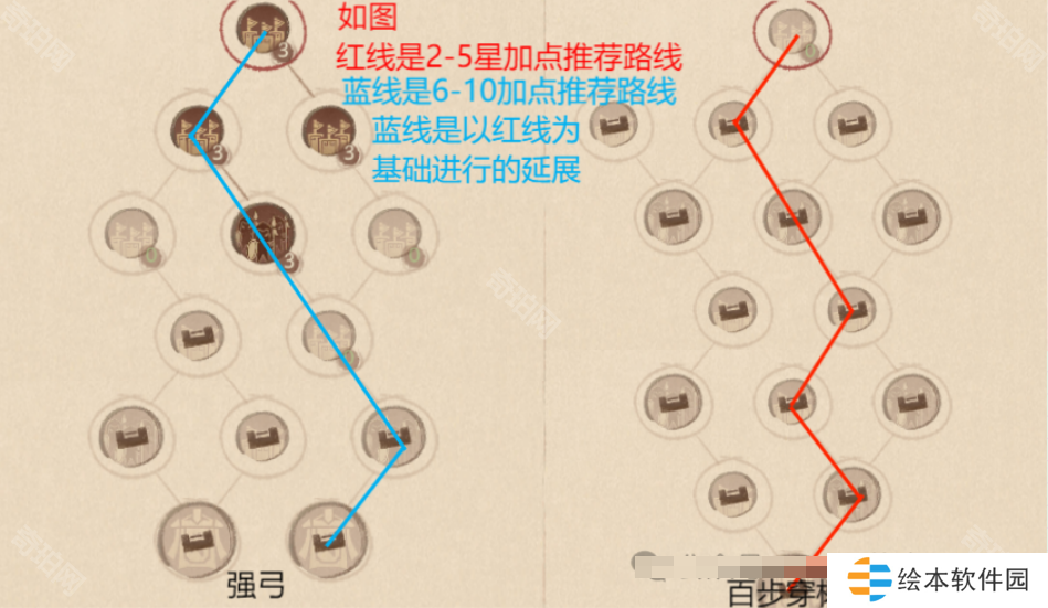 强弓和百步穿杨对应爆发队,提升最终伤害是关键。所以先点红线部分提升僚属收割能力,后面星上来了继续加点蓝线部分提升暴击率。