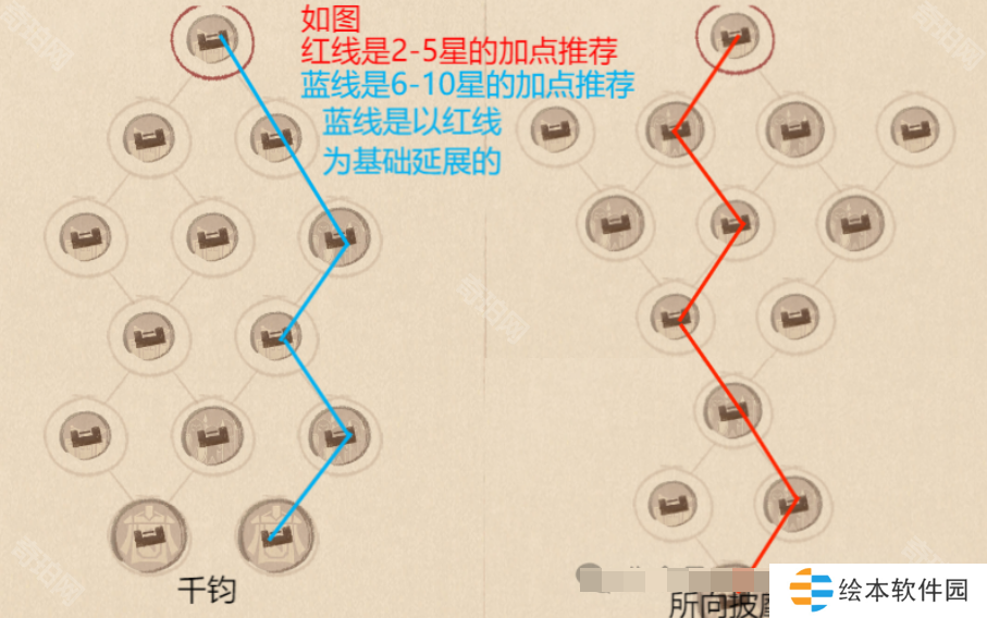 千钧和所向披靡对应普攻队,提升僚属的普攻输出是关键。所以5星前按红线加点提升普攻速度,5星后按蓝线加点提升普攻伤害。