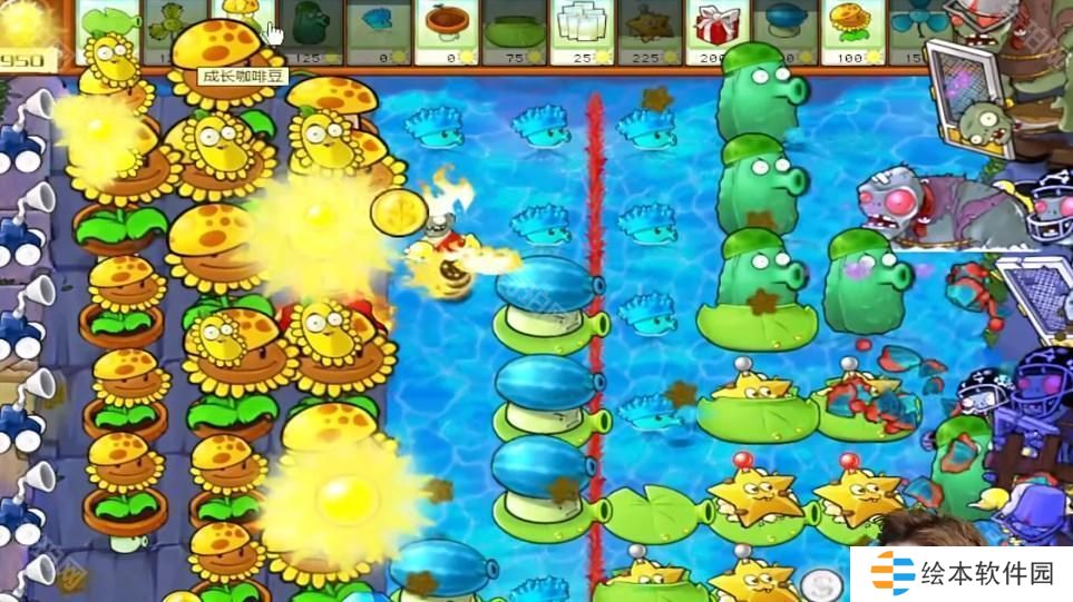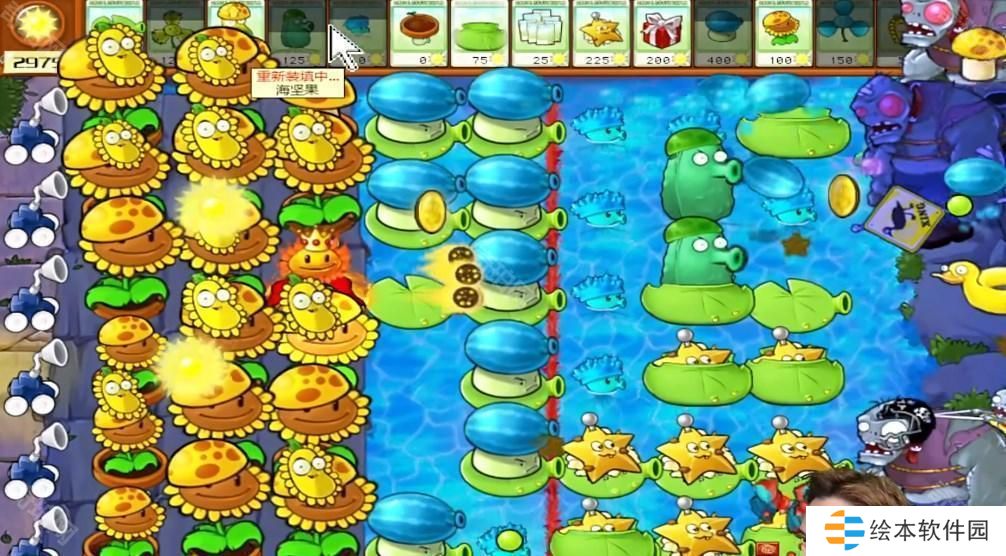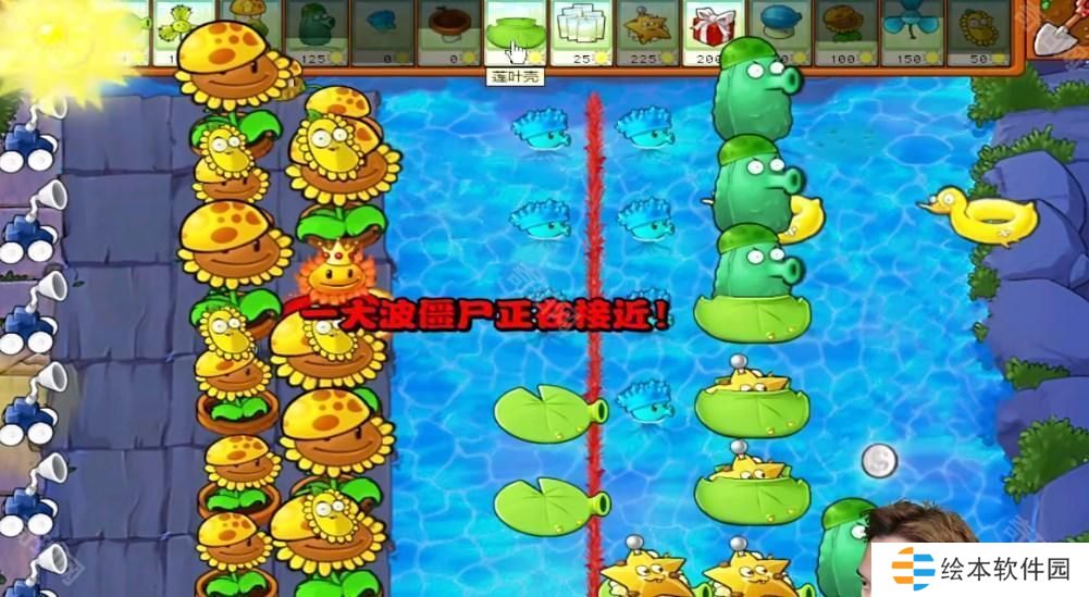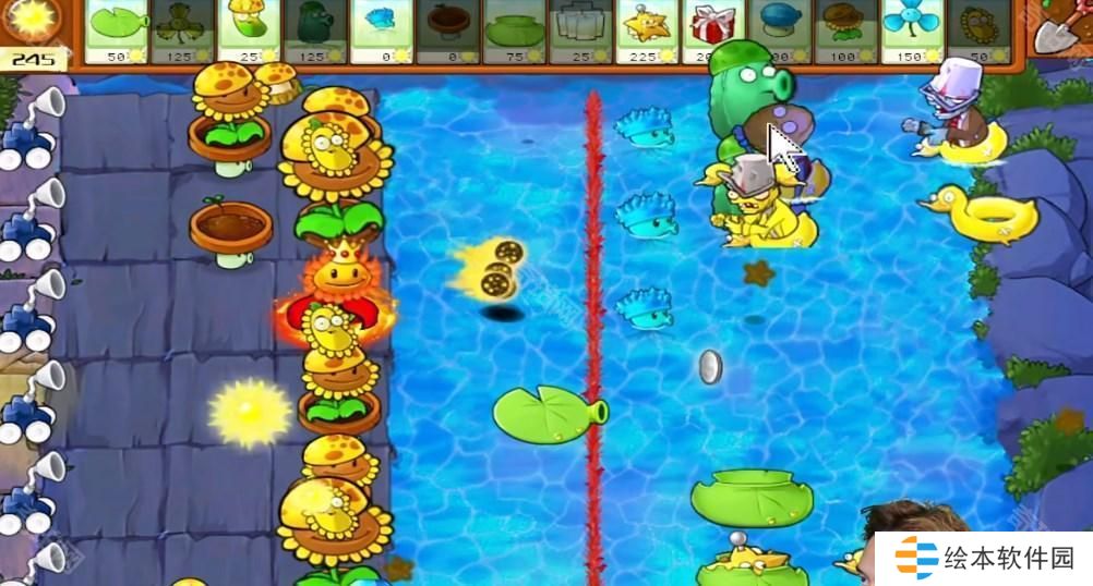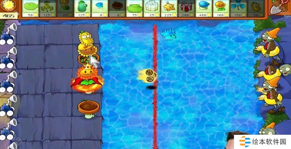 2、后面多布置阳光向日葵,头上放上阳光豆,在水面上面布置莲花壳。