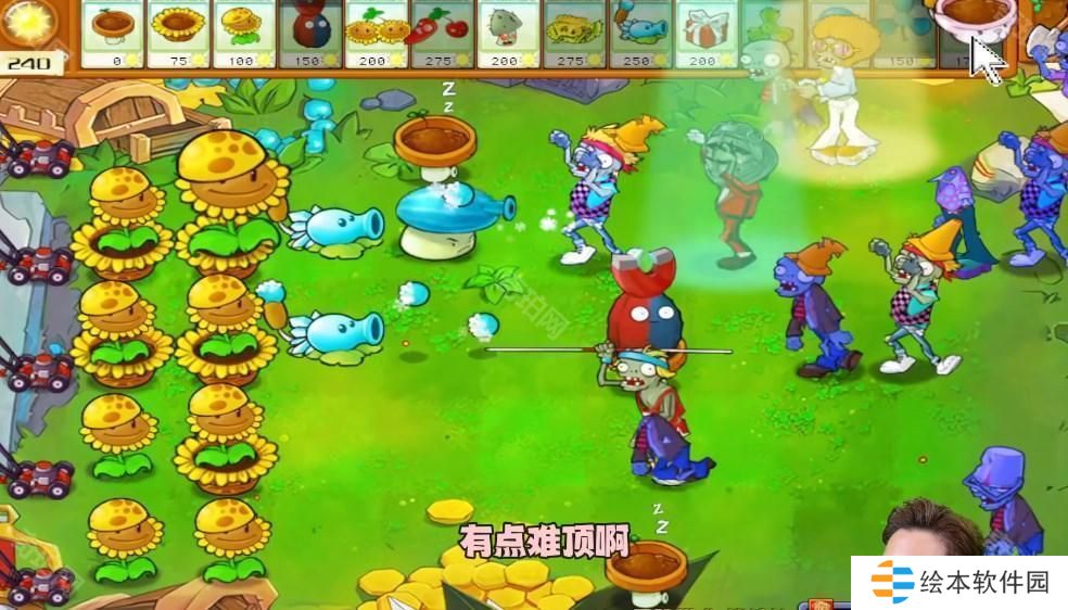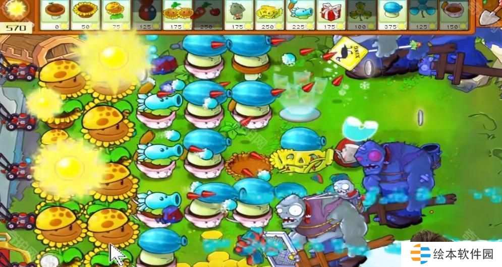 2、最上面也是可以放花盆的,放点花盆防御,下面放寒冰香蒲和冰瓜大喷菇来攻击。