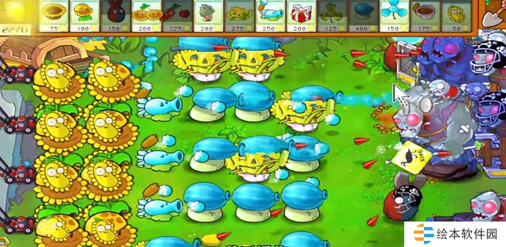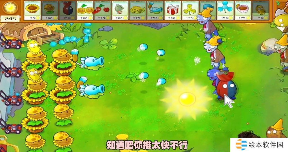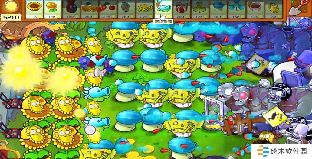 2、种植寒冰香蒲来攻击,这个攻击的豌豆可以转向,可以攻击其他路上的僵尸。