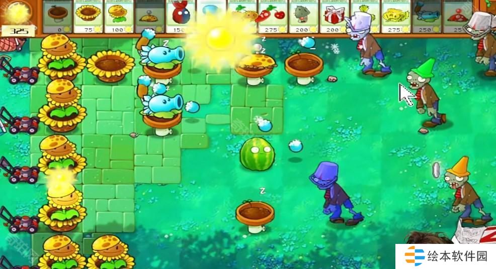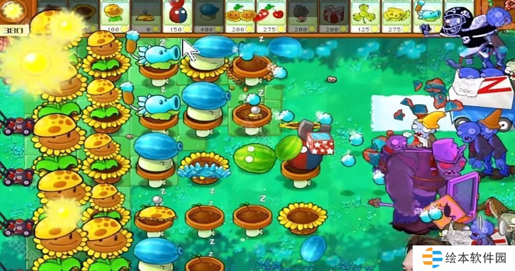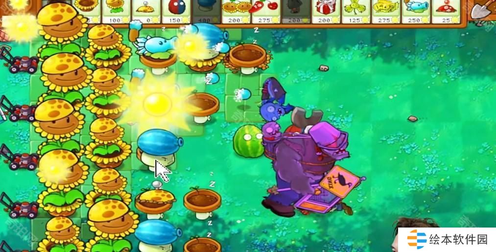 3、后面几波的僵尸就比较难了,我们可以放点冰瓜大喷菇。