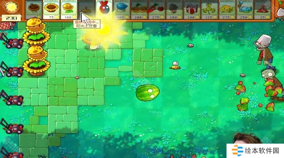 1、这一关卡是部门砖部分草地的类型,开局我们还是先放阳光花盆建造阳光向日葵,这个收集能量很快。