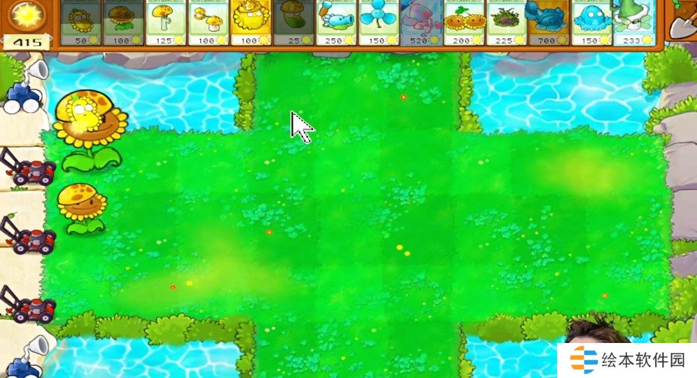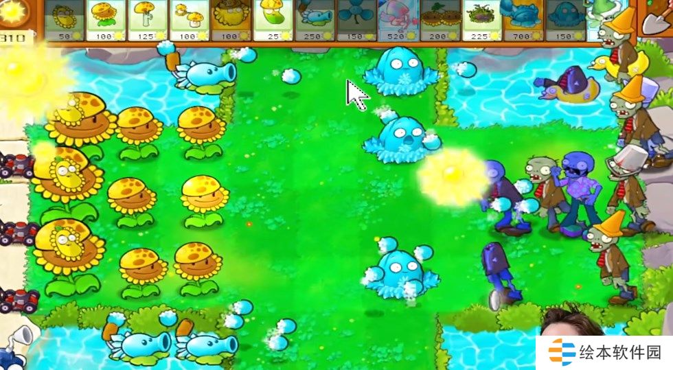 4、水池不要忘记防御,在水池上面种植豌豆睡莲,睡莲上面摆放寒冰香蒲。