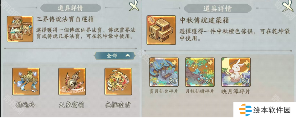 当期主题可以获得一个三界法宝自选箱子,往期主题可以获得一个中秋传说建筑自选箱子!另外运气好还能抽中自选大奖(仙友/精怪)