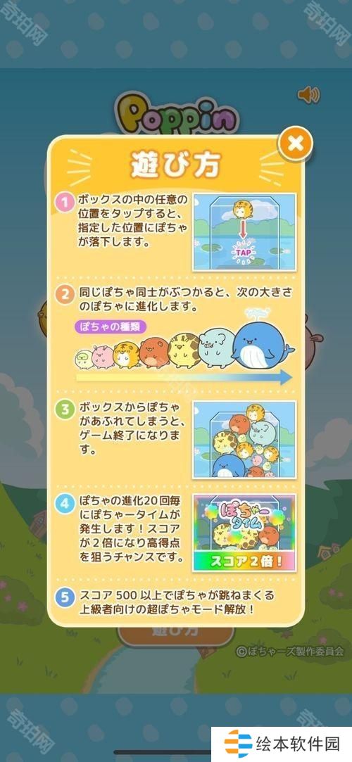 官方表示,《Poppin 圆鼓鼓动物》是一款让 “圆鼓鼓” 化的可爱角色「圆鼓鼓动物」掉落的简单益智游戏。让相同的 “圆鼓鼓动物” 碰撞,牠就会变成更大的 “圆鼓鼓动物”,当箱子被塞满 “圆鼓鼓动物” 时,游戏也随即结束。另外,“圆鼓鼓动物” 每进化 20 次,就会发生一次让得分变为 2 倍的「圆鼓鼓时间」。并且,当得分达 500 分以上,将开启适合进阶玩家的「超圆鼓鼓模式」。