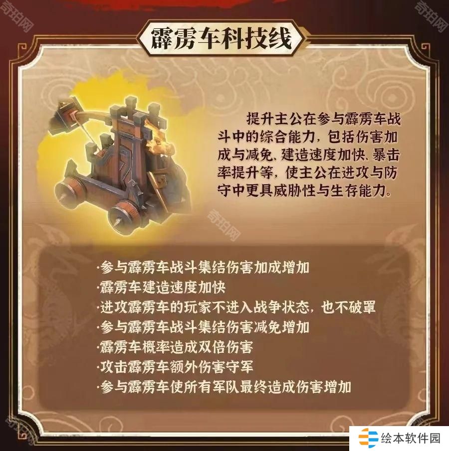 增加攻打霹雳车时的伤害和防守霹雳车时的防御,并且增加建造的速度和破坏力,破坏力指暴击,即可以让地方增加更多的伤兵,霹雳车有概率造成双倍伤害,即由原来的2点伤害变成4点伤害,攻击霹雳车里的守军使其的重伤更多,增加对霹雳车集结进攻的最终伤害,参与霹雳车进攻的防守方,可以开启保护罩,并且不进去战争状态,使进攻方提高了威胁力,防守方提高了生存能力。