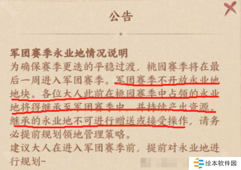 官方发布了新公告,提示我们军团赛季没有永业地了,但是可以继承桃园赛季拥有的永业地持续产出资源。所以我们在军团赛季前一定要尽可能的提升永业地相关资源的产出。