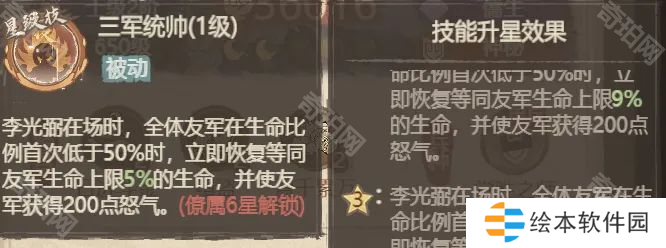 全体友军生命低于50%增加200怒气并恢复生命,小编个人觉得这个技能才是真的神技能。