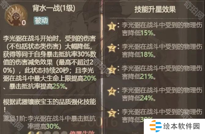 开局可以默认增加最高50%的暴击抵抗、20%伤害减免、20%生命,星级拉满还可以增加30%的物理减免,相当于物理输出伤害减免50%。增加自身坦度的技能远不如群体免伤或者分摊强,这个技能看似很牛,但是只有他自己活下来毫无意义。