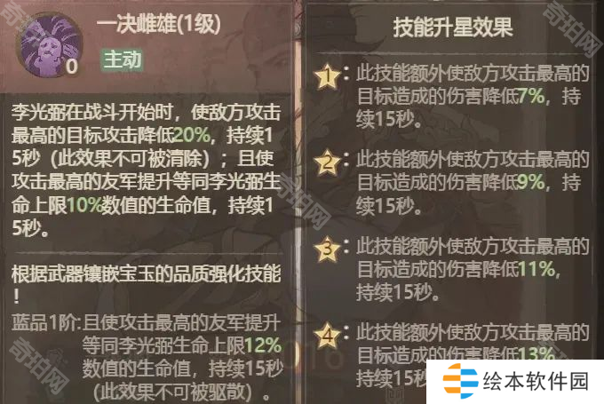 降低敌人最高攻击力20%(主c),并且额外最高降幅伤害15%,刚好与宁姚的剑胆琴心星级增伤抵消,同时增加我方攻击力最高僚属20%生命(李光弼)。