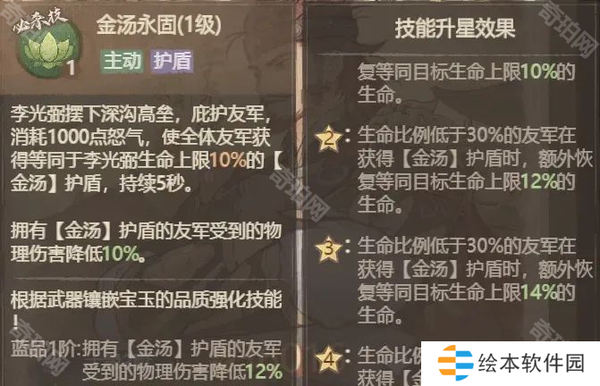 必杀技能为增加护盾5s,并提供最高20%的物理免伤,星级效果对于低于30%生命额外增加护盾。