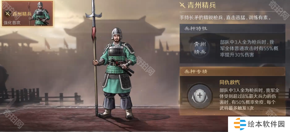 兵种特性:部队3人全部为枪兵的话我军全体普通攻击时有55%的概率提升30%伤害。