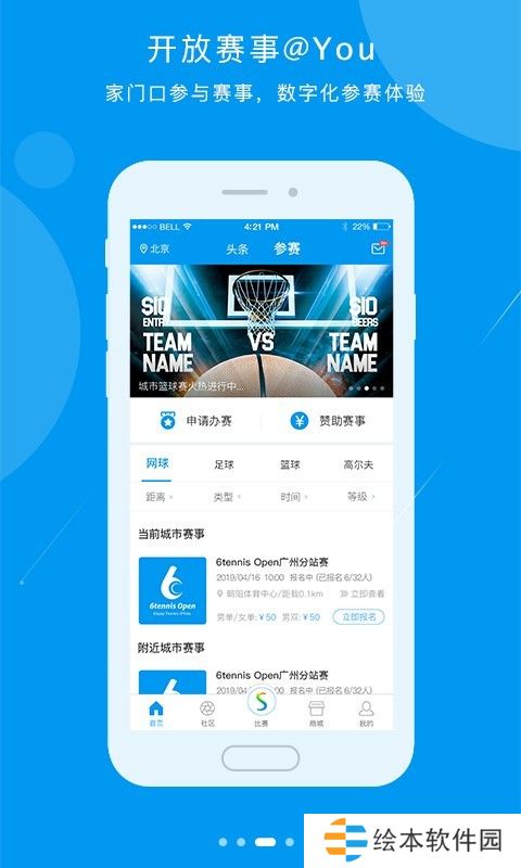 【开放赛事@You】在线报名,在家门口就能参加体育赛事;数字化参赛体验,全方位记录运动生涯;跟进赛事的深度报道,给你一球成名的机会;统筹全局的积分体系,还有丰厚奖品等着你!覆盖全国各个城市的易赛赛事,便是为你量身打造的全开放综合体育舞台。(后期赛事不断拓展可改为“易赛赛事”)