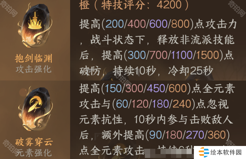 打造效果:一个破防向,一个元素向。破防向提供800点攻击力,战斗时触发1500点破防(40%覆盖率);元素向提供600点元素攻+240元素忽视,击杀/助攻敌人提供360元素攻。