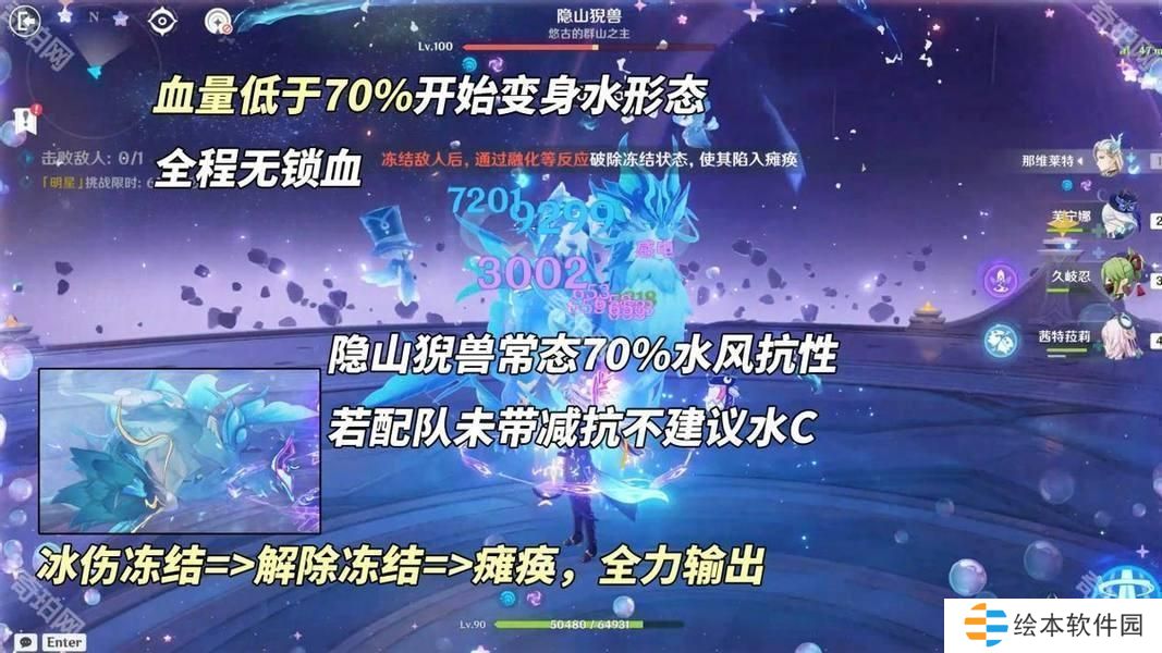 常态70%水风抗性,其余10%抗性。隐山猊兽血量低于70%开始进入水形态,此时冰元素伤害可将其冻结,解除冻结时瘫痪倒地。