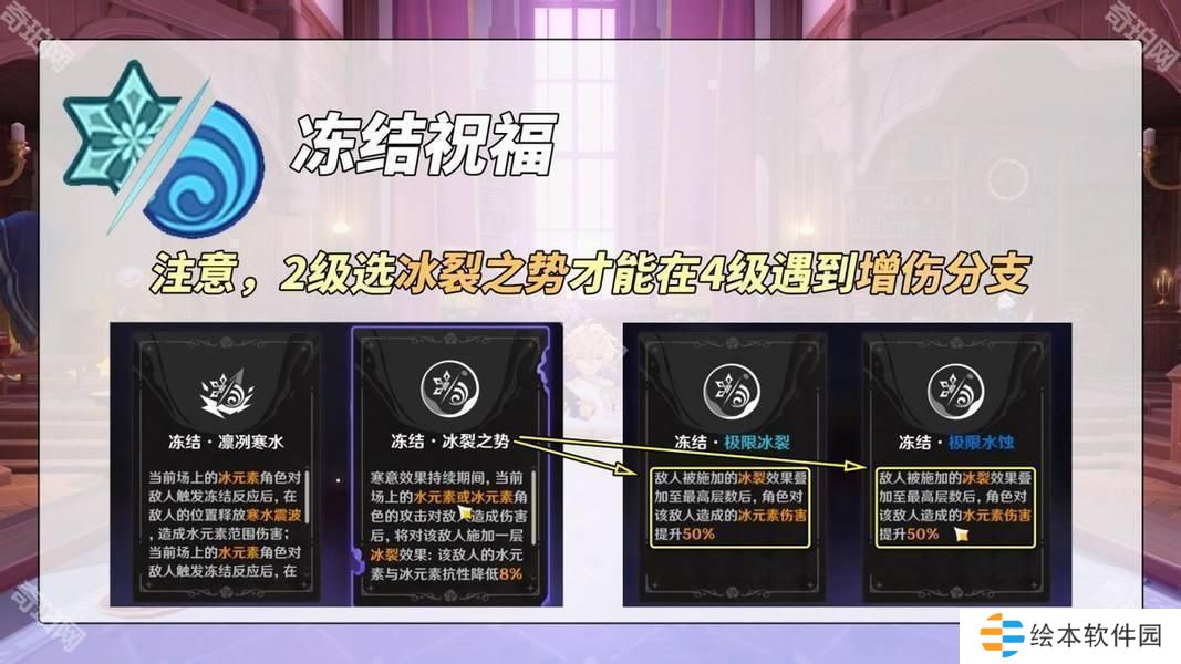 推荐走2级冰裂之势24%水冰减抗,在4级时依照自身剩余主C选择:极限冰裂50%冰伤增幅,或极限水蚀50%水伤增幅。