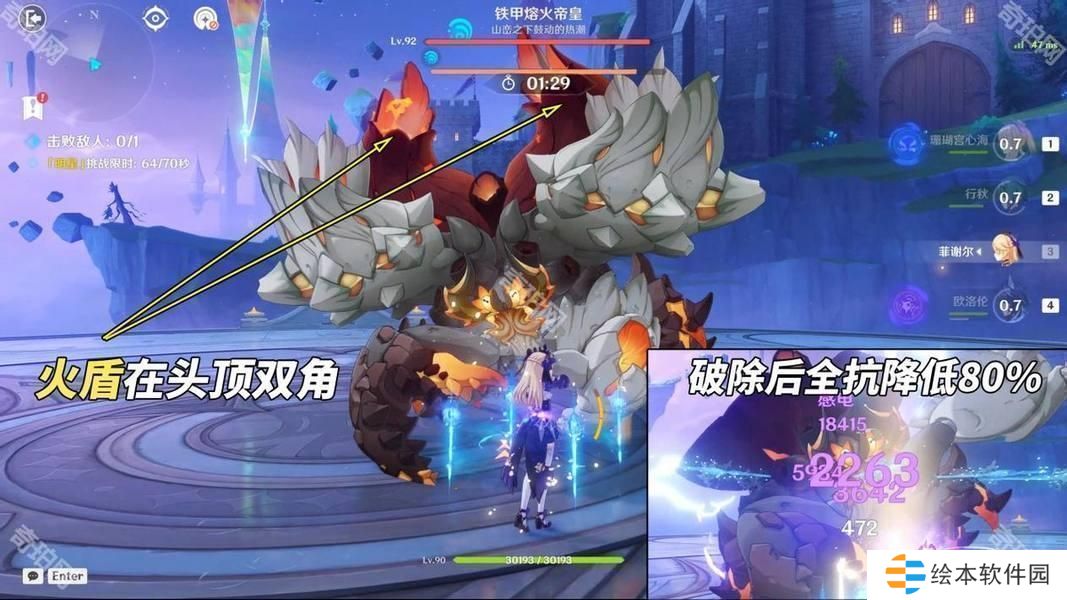 头顶双角存在时火抗140%,其他抗性90%,需使用水元素伤害攻击其头顶双角,破除后全抗降低80%,大幅提升造成的伤害。