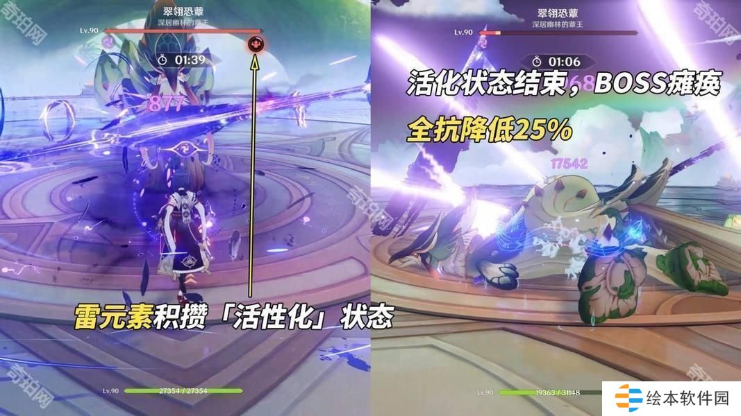 尽量使用雷元素角色,通过雷伤积攒其血条旁「活性化」状态进度。活化状态翠翎恐蕈会施放勐烈攻击,随后瘫倒在地,全抗降低为0%(常态25%全抗)。