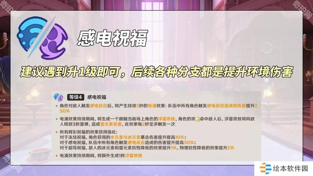 正常解锁1级即可,提供250%感电反应伤害增幅,后续升级更多是环境伤害提升,对角色数值影响不大,补伤用途。
