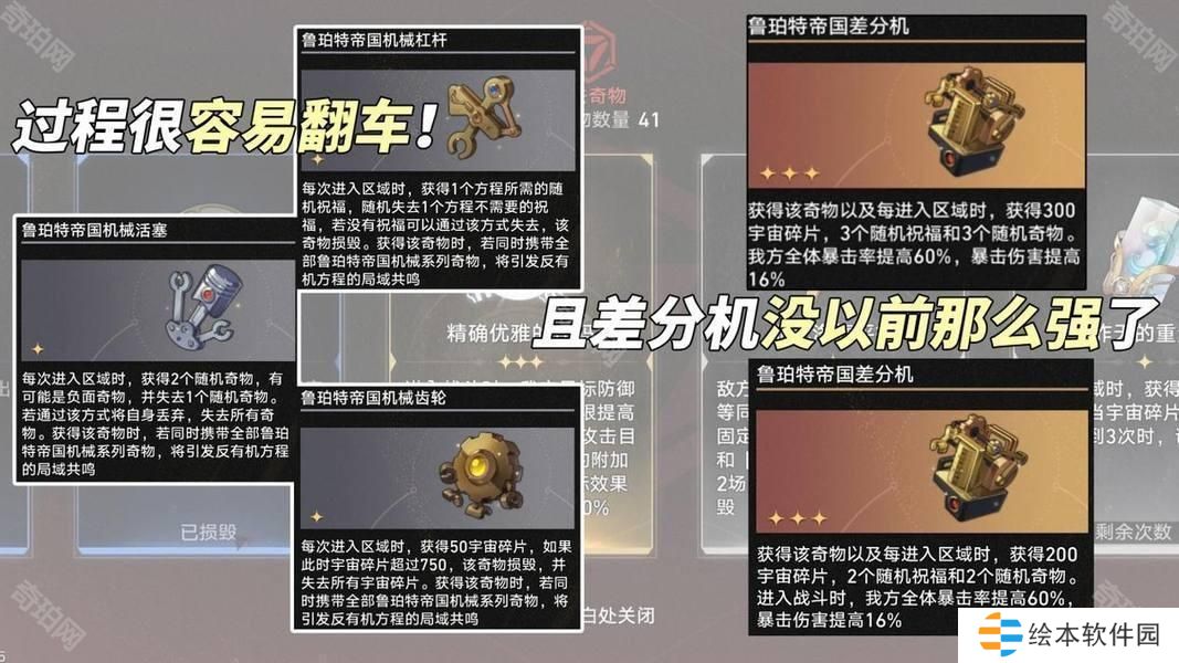 你的3星差分机确实很有实力,但收集过程太过痛苦,‘机械活塞’概率给你塞负面奇物或直接丢弃全部奇物,‘机械杠杆’概率丢弃非方程所需却又非常关键的祝福(击破/击杀再动、全队伤害分摊、受击回血等等),‘机械齿轮’超过750碎片直接失去所有碎片。