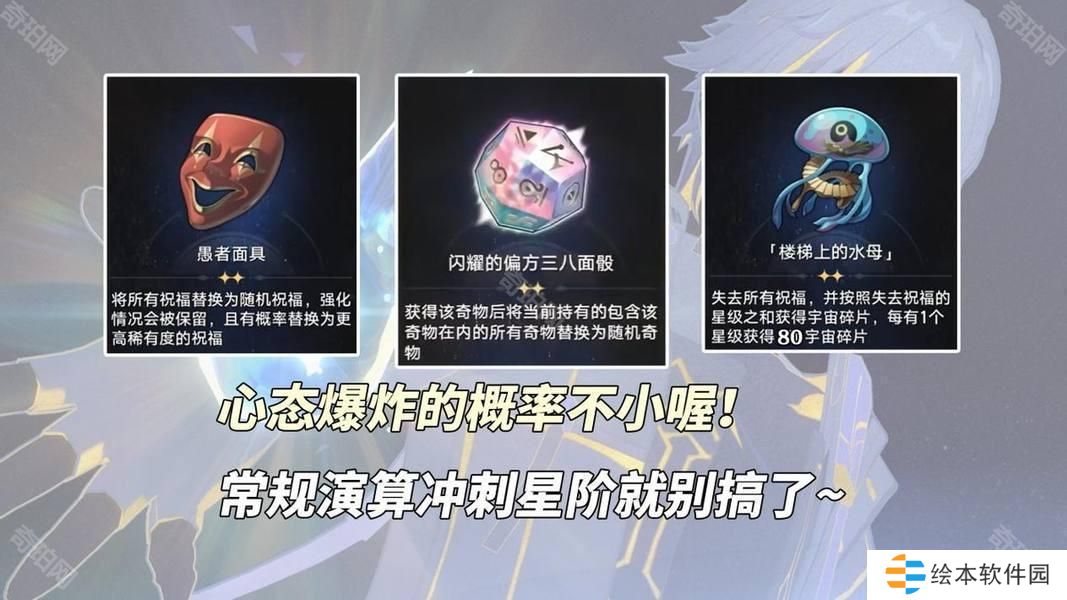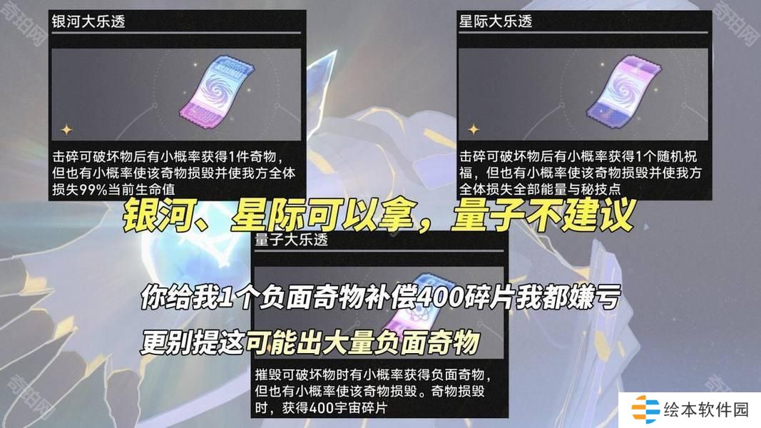 一定要看清楚是哪个大乐透!此次一共有3种,‘星际’是随机祝福或损失全体能量与秘技点(负面效果最弱大胆选)、‘银河’是随机奇物或损失全体99%生命值(若在BOSS关前炸了可用记忆主秘技推条让生存位先动救一波)、‘量子’随机负面奇物或400碎片(给你一堆负面奇物能不选就不选)。