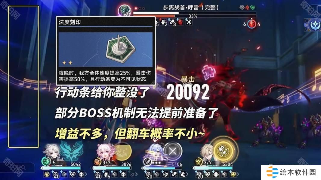 夜晚有25%速度与50%暴击伤害,代价则是行动条不可见。我的评价是,打得过不差这点增幅,打不过或勉勉强强的隐藏行动条直接致命。