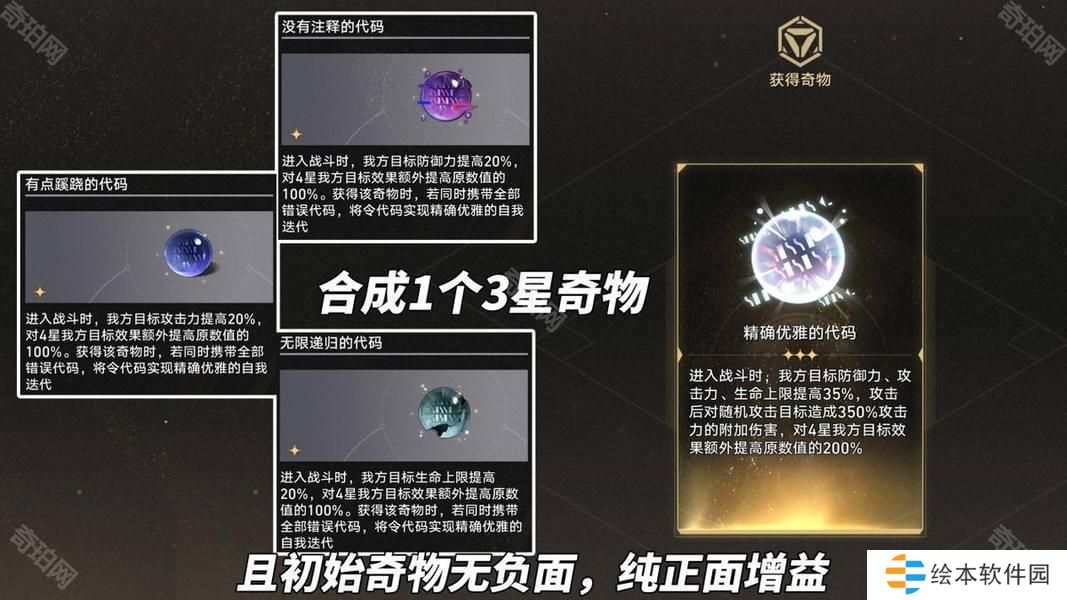 同时集齐三项,将直接合成为3星奇物‘精确优雅的代码’,35%防御、生命、攻击加成,攻击附带350%攻击附加伤害,4星角色额外提高原数值的200%。