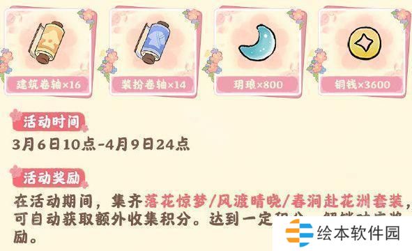 版本更新后,在活动期间集齐落花惊梦/风渡晴晓/春涧赴花洲套装即可获得额外收集积分,达到一定积分后就能获得奖励