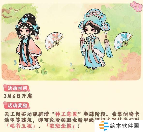 版本更新后天工图鉴功能新增“神工意匠”叁肆阶段,收集创物卡池甲等建筑即可免费获得【唱书玉祝】和【歌班金梁】