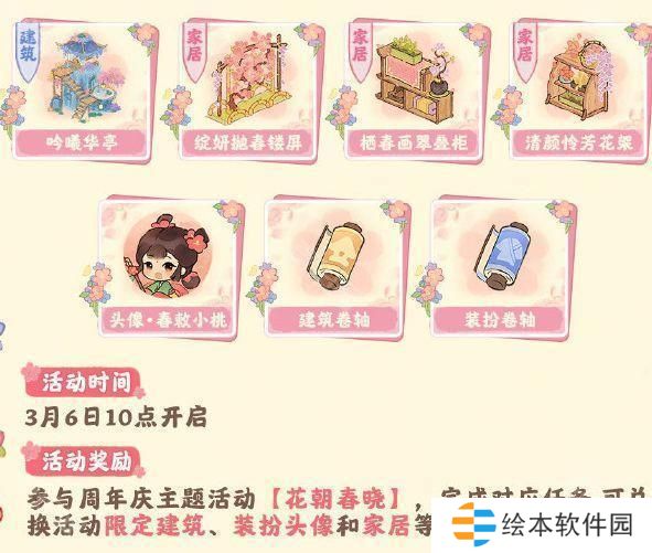 版本更新后,完成2周年主题活动【花朝春晓】对应任务即可兑换活动限定建筑、装扮头像和家具等奖励