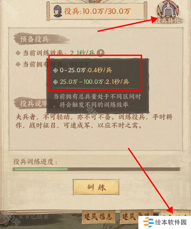 当兵营总兵力在0-25万时,训练效率为0.4秒/兵,当兵营总兵力超过25万,那么训练效率为2.1秒/兵。而且这个自动造兵的功能是不收取任何粮草的。
