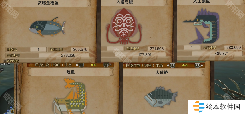 游戏中一共有5种大鱼,分别是贪吃金枪鱼、入道乌贼、大王旗鱼、咬鱼和大珍鲈
