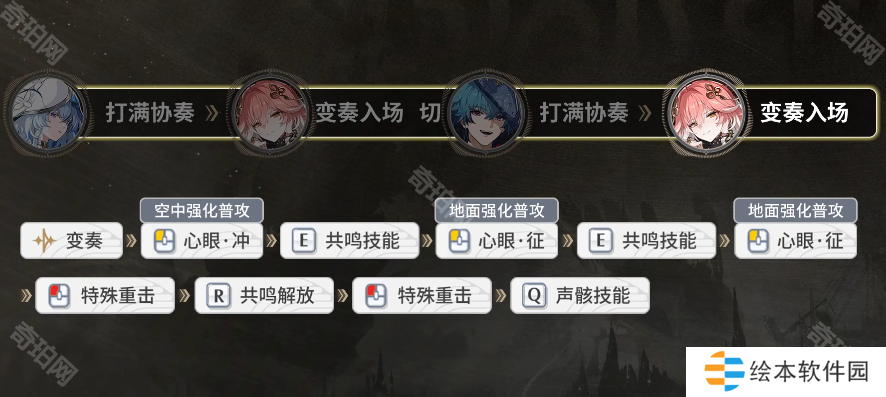 队伍输出手法:守岸人打满协奏>布兰特变奏入场>切散华打满协奏>守岸人变奏入场