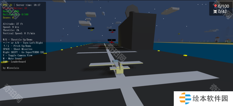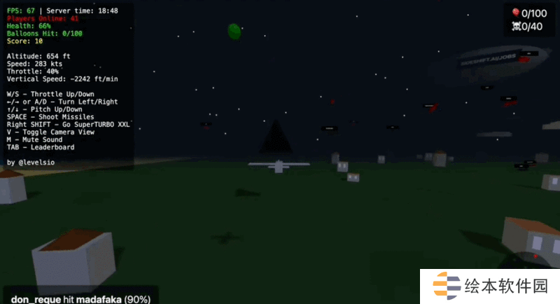 左上角的方框内显示了游戏帧数、在线人数、飞机耐久度、气球击破数、飞机飞行速度和游戏操作等内容